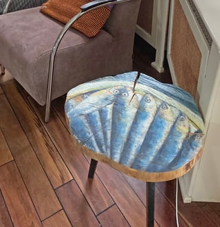 ideeën ben ik doorgegaan met het beschilderen van stukken gesneden boomstam, gekocht bij een grote zagerij aan de Leidsevaart in Heemstede. De olieverf die ik gebruikte geeft een mooie diepe